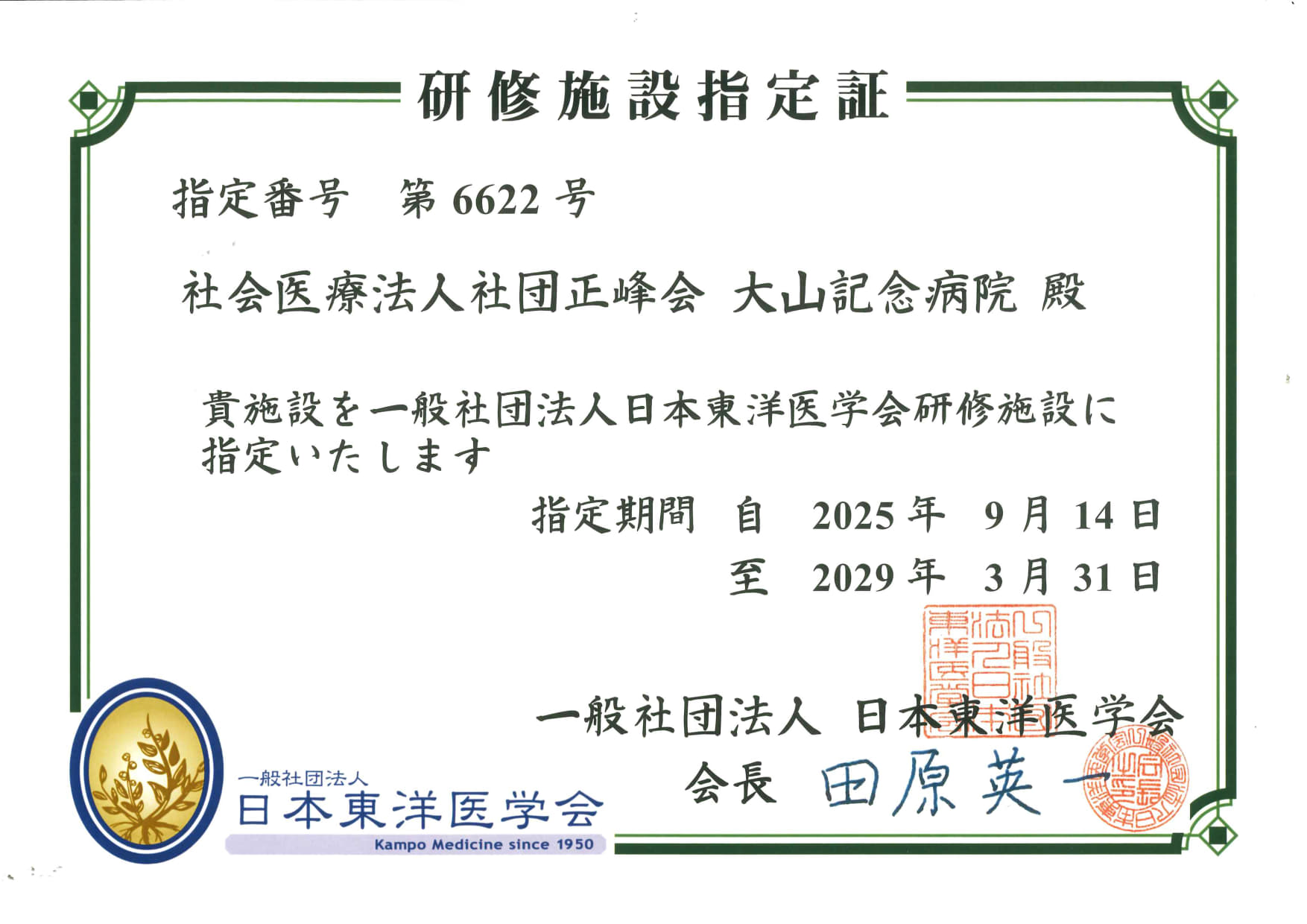 研修施設指定証_日本東洋医学会_1 | お知らせ | 大山記念病院