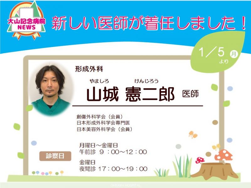 2026.01.05 医師着任のお知らせ 形成外科 令和8年1月5日(月)より整形外科に新しい医師が着任いたしました。 ■形成外科 山城 憲二郎(やましろ けんじろう)医師 ■外来診察日 月曜日~金曜日(午前診) 9:00~12:00 金曜日 (夜間診)17:00~18:30