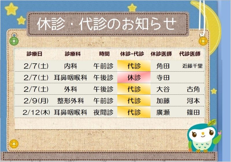 外来休診情報 2026.02.06時点 | お知らせ | 大山記念病院